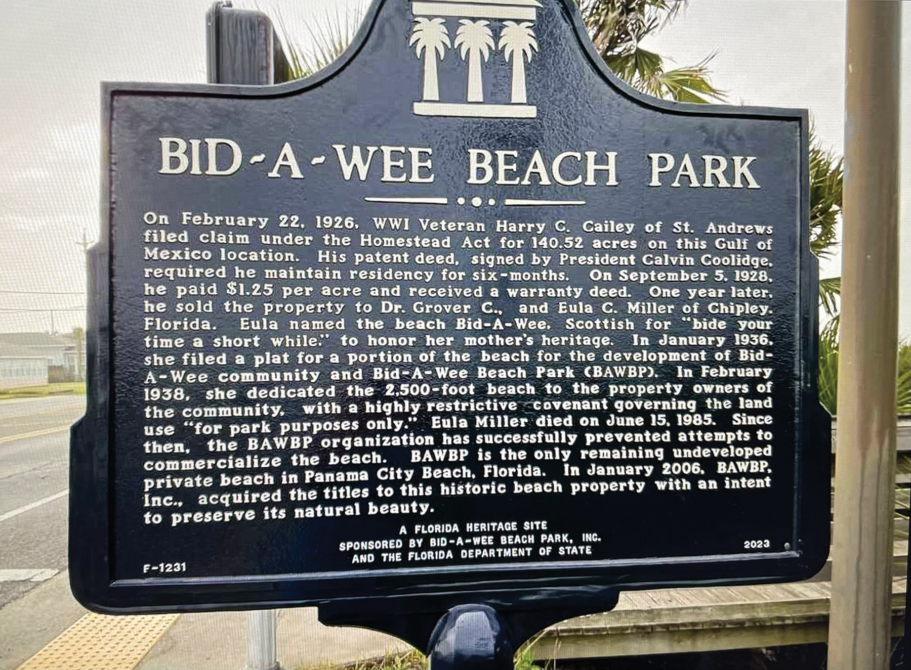 On February 22, 1926, WWI Veteran Harry C. Cailey of St. Andrews filed claim under the Homestead Act for 140.52 acres on the Gulf of Mexico. His patent deed, signed by President Calvin Coolidge, required he maintain residency for six months. On September 5, 1928, he paid $1.25 per acre and received a warranty deed. One year later, he sold the property to Dr. Grover C.and Eula C. Miller of Chipley, Florida. Eula named the beach Bid-A-Wee, Scottish for “bide your time a short while,” to honor her mother’s heritage. In January 1936, she filed a plat for a portion of the beach for the development of Bid-A-Wee community and Bid-A-Wee Beach Park (BAWBP). In February 1938, she dedicated the 2,500-foot beach to the property owners of the community, with a highly restrictive covenant governing the land use “for park purposes only.” Eula Miller died on June 15, 1985. Since then, the BAWBP organization has successfully prevented attempts to commercialize the beach. BAWBP is the only remaining undeveloped private beach in Panama City Beach, Florida. In January 2006, BAWBP, Inc., acquired the titles to this historic property with an intent to preserve its natural beauty.