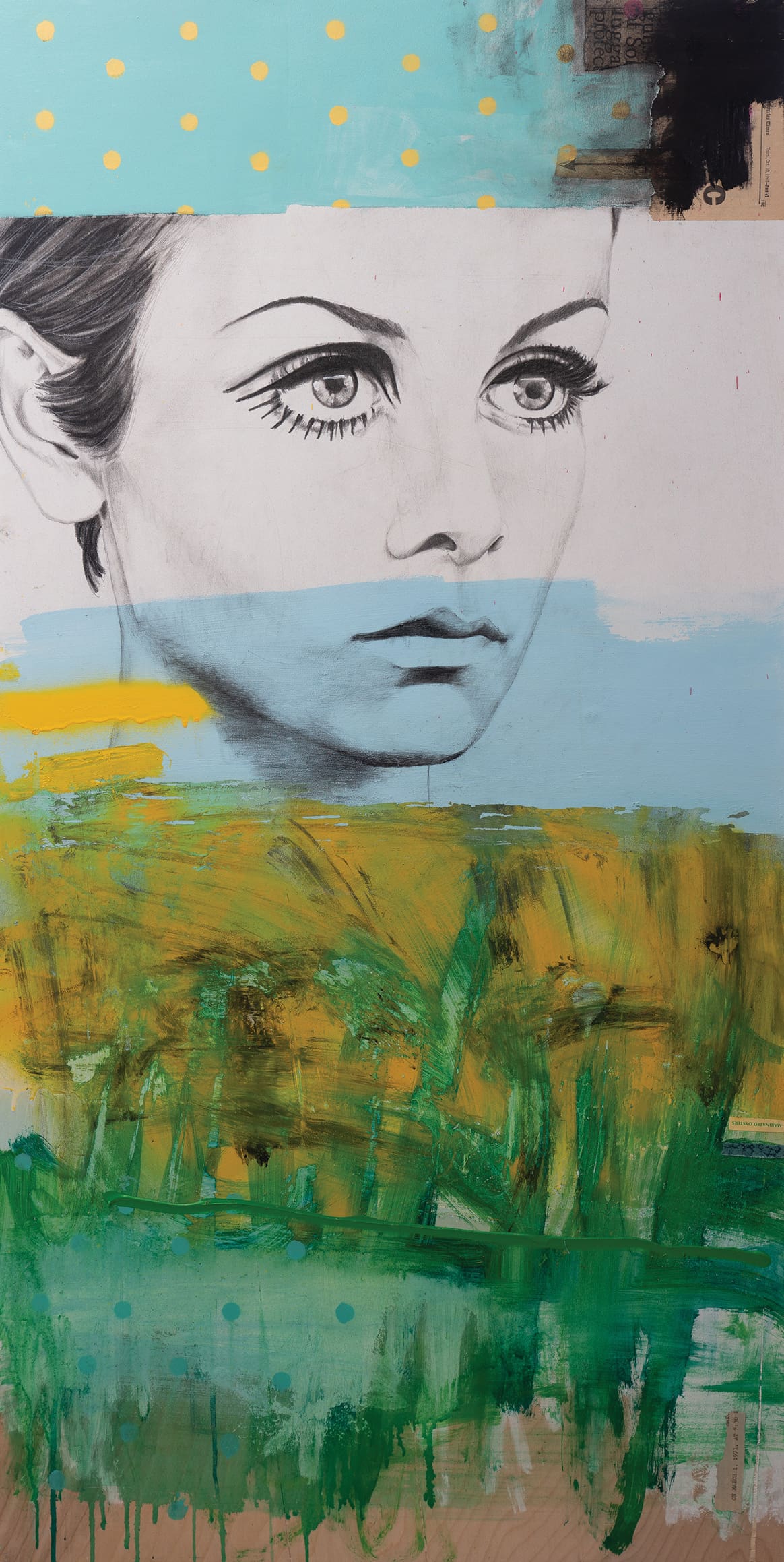 Born and raised in Panama City, Anderson considers himself a contemporary artist, describing his work as abstracts with a ‘collage aspect.’ “I play with traditional stuff, I play with abstract, I just play,” he says. Anderson got his start at the kitchen table as a child, with pencil and paper. This connection to drawing, and by extension, realism, you can see in many of his works. Though he frequently incorporates pencil drawings, there are also printed papers, vintage fabrics, and oil stick marks mixed in with the spray paint and house paint he likes to use. Anyone familiar with Jean-Michel Basquiat will note hints of his oeuvre in Anderson’s, but the artist also cites other early influences, like Andy Warhol, and the painter Dean Mitchell, who was raised in nearby Quincy. While some in this coastal region might turn to the sea for ideas, Anderson’s work is less focused on location, though there’s the occasional link to local scenery in his unique interpretations of sand and sea. More often though, you’ll spot pop culture figures, like Twiggy, or the muscular frame of a pugilist, skillfully rendered against a visual sea of color or artfully composed collages.