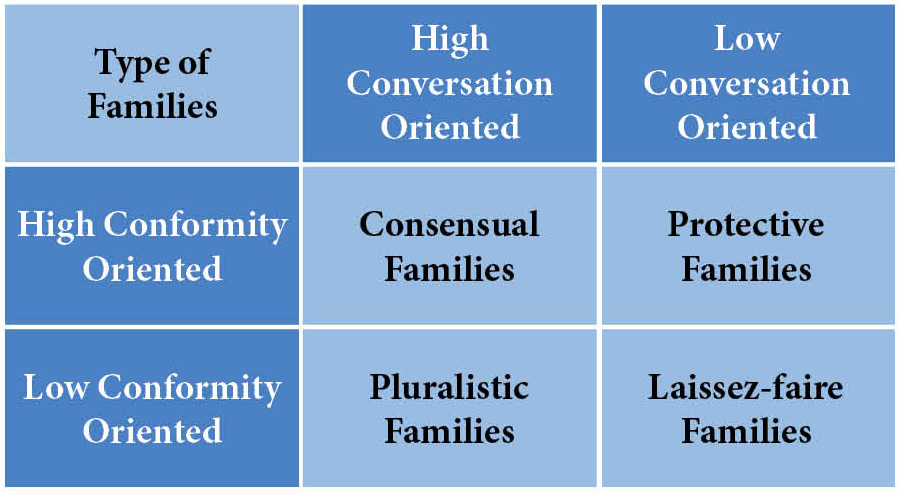 With Conversation Orientation and Conformity Orientation in mind, Ascan Koerner and Mary Ann Fitzpatrick identified four types of families: