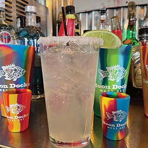 Nothing better than a Boon Docks Margarita! We squeeze fresh juices daily, concoct our own sour mix and add Patron. Enjoy! Relax, sip, look out over the water and watch the barges go by, the occasional dolphin swim by, even an alligator or two, and our mascots, the ducks and geese, who come in for their favorite – hushpuppies.