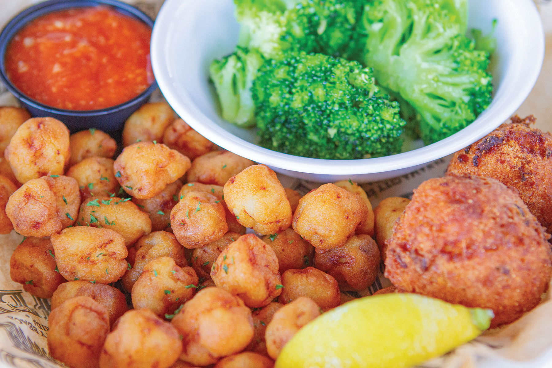 Fried Bay Scallops: While The Wicked Wheel may be best known for their signature fried chicken, they also offer a variety of delicious seafood dishes, such as their Backfire Shrimp appetizer, Cajun Seafood Mac, or their Fried Bay Scallops – a generous portion of fresh Bay scallops, hand-battered and deep-fried to a crisp golden perfection. Join them for Happy Hour every day from 3-5 p.m.