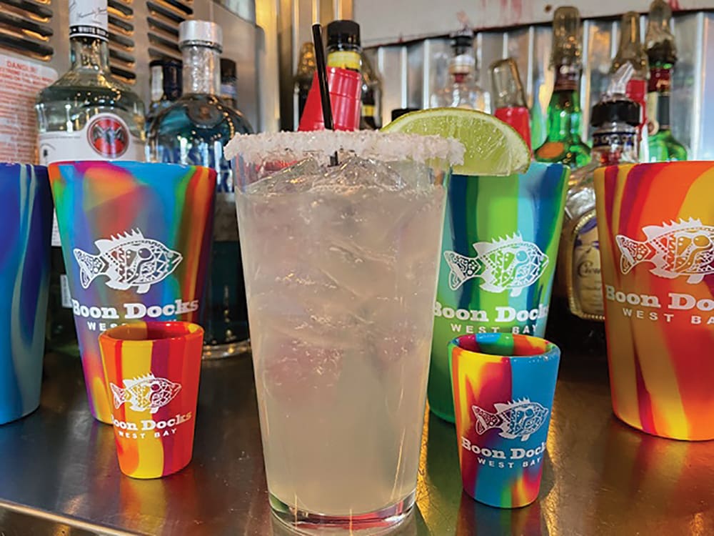 Nothing better than a Boon Docks Margarita! We squeeze fresh juices daily, concoct our own sour mix and add Patron. Enjoy! Relax, sip, look out over the water and watch the barges go by, the occasional dolphin swim by, even an alligator or two, and our mascots, the ducks and geese, who come in for their favorite – hushpuppies.