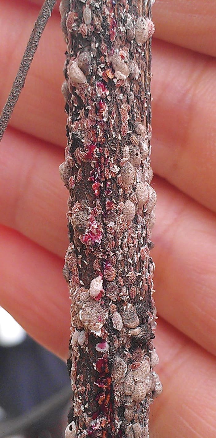 Growing Crapemyrtle Bark Scale Are White To Grey And Ooze Pink. G Knox UfifasUsually, the first sign that there is a problem is the appearance of a black substance on stems, bark, or foliage. This is a fungal complex called sooty mold that grows on a sugary substance excreted by sap feeding insects called honeydew. If you see sooty mold should look for the insect responsible. On crapemyrtles the most likely culprit is the crapemyrtle aphid which feeds on tender new leaves and stems. Aphids are translucent soft bodied insects that reflect the color of their food source, usually green on crapemyrtles. If aphids are not present inspect the bark and branches for small gray/brown insects soft bodied insects with a white waxy substance surrounding it that ooze pink if crushed, this could be crapemyrtle bark scale. The scale feed on woody tissue and may be found near pruning scars, branch angles, or on the main trunk.