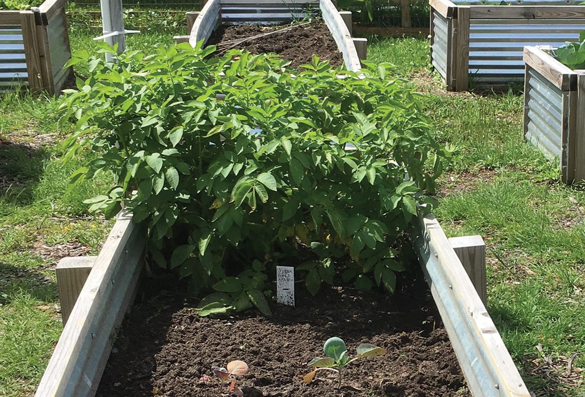 Potatoes need full sun, well-drained soil, and regular water and fertilizer to perform at their peak. Seed potatoes should be planted about 4-inches deep and 6-8 inches apart, and soil may need to be added if potatoes start to push to the surface. Consider all of these when selecting the container or raised bed. Ensure your container has adequate drainage holes, as potatoes are prone to rot in saturated soils. Recycling a nursery pot from a large shrub or tree is a great way to keep your cost low if you have any on hand. Be sure to clean any pots that have been used previously with a 10% bleach solution then rinse well before adding new potting soil. Commercial potting mixes are recommended to prevent introduction of weeds, pests, or disease.