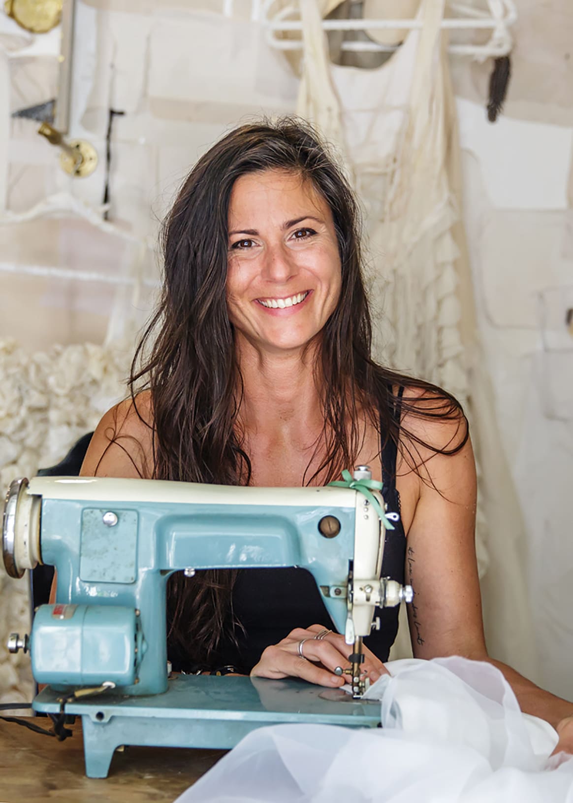 In the past, you could find her bathing-suit clad, a toddler attached at the hip, stopping in on a rare day off to custom fit a client’s dress. Back again in Florida this spring, you’ll still find kids in tow, slightly older now, but thoroughly part of the process. Though her couture pieces can be found at galas and other formal events, Paloma herself is decidedly down to earth. Wandering barefoot between bolts of fabric, there’s a good chance she’s been hard at work since the early morning hours, and will be there still long after everyone else has called it a day, subsisting on her three c’s: chocolate, cheese, and coffee.