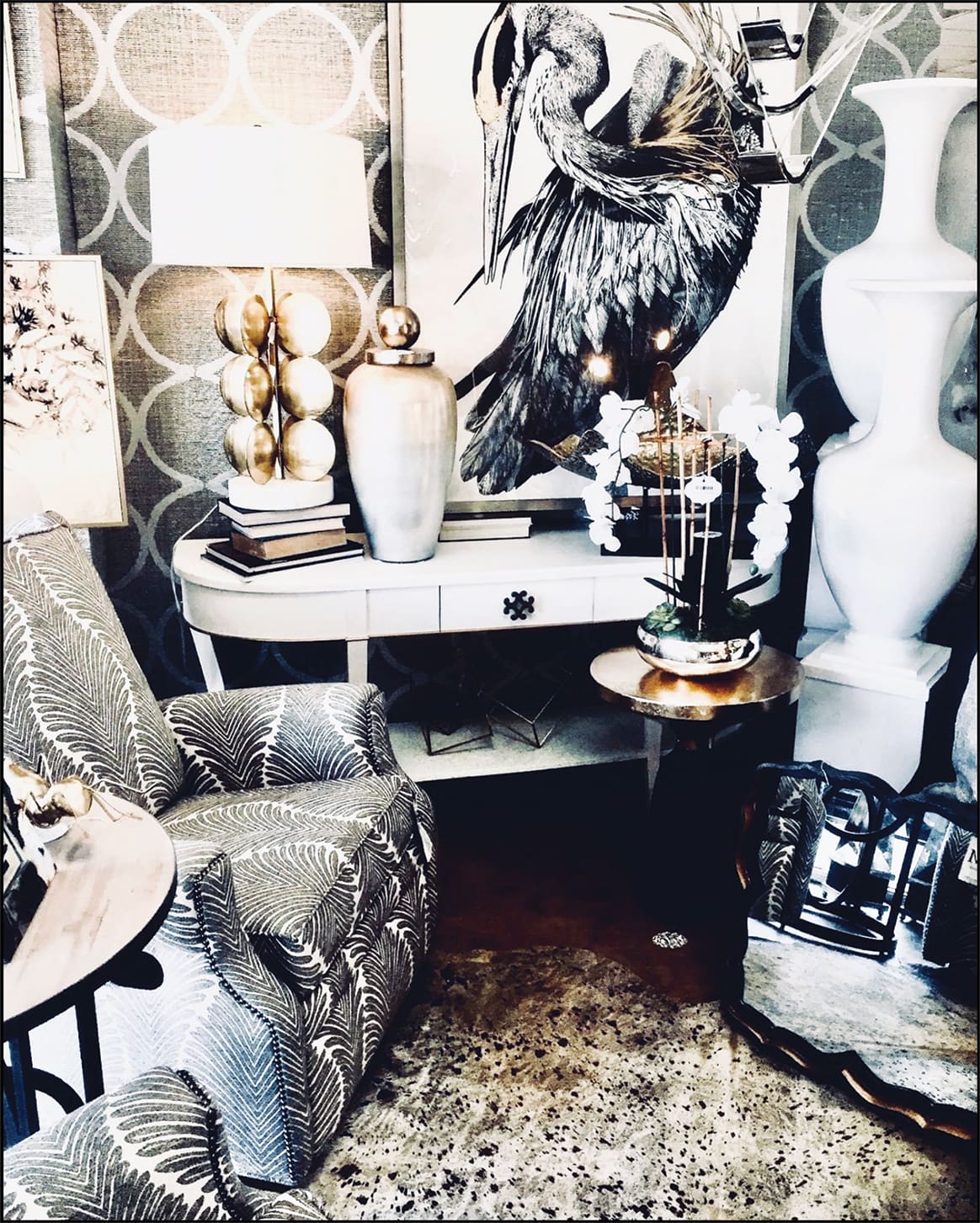 We have pictured here a captivating Heron, and this bold piece instantly brings contrast, texture and emotion into the space. Upholstery, lighting, linens and all accessories are chosen to bring balance and enhance a focal point. All work together to create a “raise the bar” space.