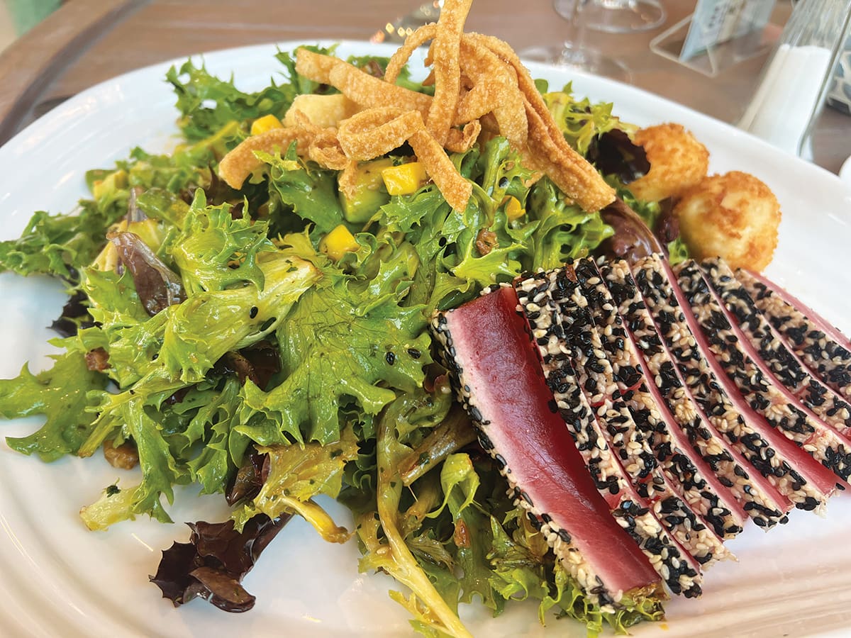 This establishment serves lunch and dinner daily, and with its central location and proximity to so many businesses, Blu is becoming the “It” meeting spot for business lunches and dinners, friend meetups, and social gatherings by the locals. Michelle started bringing out a succession of dishes from the Sharables, Hot Hands and Entrée menus. The stunning Emerald Tuna Crunch salad got our attention with its pepper-crusted, seared ahi tuna strips laid over baby greens, fresh mango, avocado, applewood smoked bacon, and topped with almonds, crispy wontons, and fried goat cheese with a splash of mango sesame vinaigrette.