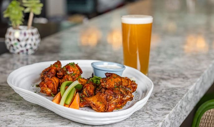 Then Michelle brought the powerhouse of the feast, Filet Mignon ladled in a luscious thick gravy with a toss of micro greens atop. The meat was a thick cut of the most mouth-watering, tender filet I’ve had, and this flamboyant offering looked as good as it tasted, served with smashed potatoes and a veggie medley of red & green cherry tomatoes, red & green bell peppers, yellow squash, asparagus, and onions. The men enjoyed Blu’s Jumbo Wings, crispy fried and smoked in a variety of flavors to choose from: buffalo, brown sugar-chipotle, sweet chili, spicy bbq, hot honey, and parmesan rub. I asked how they liked them… and my answer was the empty plates. A favorite “Hot Hands” plate was the Grouper Tacos… grilled and topped with kale coleslaw, avocado aioli, salsa verde, and roasted corn & black bean salsa. So many flavor sensations! Carol enjoyed what I consider to be the most unique dishes on the menu (and I will return to try this), the Roasted Cauliflower tossed in whipped ricotta and roasted chile paste, sprinkled with smoked almonds over an edamame puree.