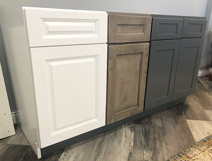 The style of the cabinet doors customers can choose from include some of the most popular designs such as shaker style, shaker style with a recessed trim or a raised panel with beveling. Cabinet colors come in white, gray or light or dark gray stain.