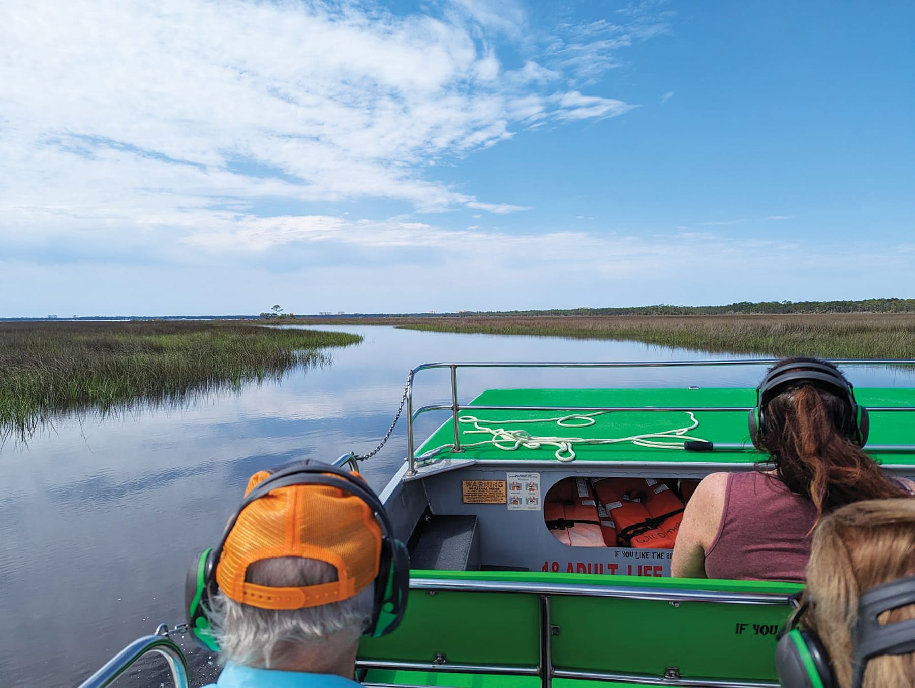 Let me invite you to take a tour across gator filled backwater creeks as you slide through the marshes keeping a close eye out for wildlife and birds of prey. No, I’m not inviting you to the bayous of Louisiana, but rather the brackish swamps and creeks of Panama City Beach. Wild Thang Airboat Tours offers visitors and guests the chance to take a thrilling, (and spinning) ride to experience Northwest Florida as you have never seen before. These airboats are highly maneuverable and can navigate through just inches of water as they glide through labyrinths of needle-rush grasses. Don’t get too comfortable though – this isn’t just a Sunday joyride. The captain frequently likes to thrill guests with 180-degree spins, and if that doesn’t sufficiently entertain you, don’t worry… he has plenty of jokes as well (if you want extra jokes, I strongly recommend going with Captain Ron’s boat!). The airboats can seat up to 16 passengers and reach speeds of 30-40mph which means it can get quite loud. Thankfully headphones are provided for hearing protection.